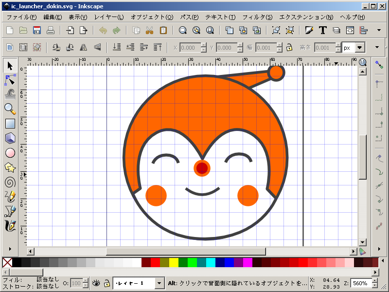 アイコンの大きさは、ldpiが36×36ピクセル、mdpiが48×48ピクセル、hdpiが72×72ピクセルです。はじめにドロー系ソフトでアイコンの元絵を作ります。次にペイント系ソフトで効果を付けます。私はInkscapeとPhotoshop Elementsを使いました。練習で子供のアイドルのアイコンを作りました。