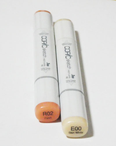 話を元に戻すと、アルコール系マーカーは混色せずに肌色を表現できています。R02はシャドーなのでE00の上から重ね塗りをおこないます。
